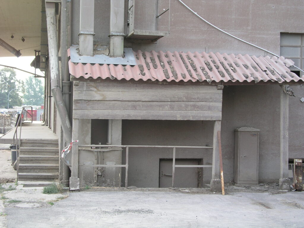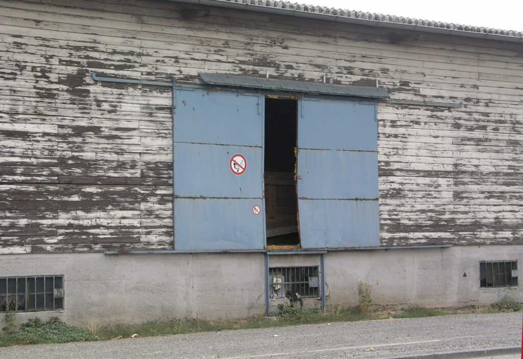 Der hölzerne Schuppen mit dem Schiebetor und der interessanten Alterung stand damals hinter dem gelben BayWa-Gebäude auf der gegenüberliegenden Straßenseite.