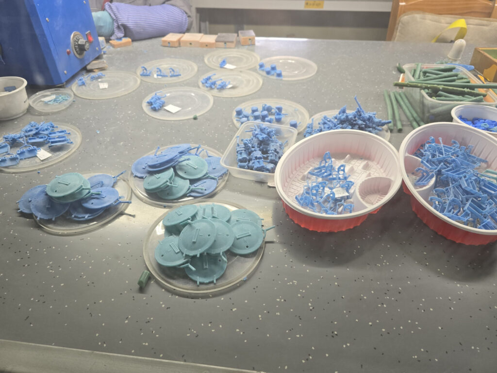 Die Arbeitsplätze der Mitarbeiter sind nach verschiedenen Aufgaben strukturiert, sodass sie ihre Fähigkeiten ausbauen und spezialisieren können. Eine Mitarbeiterin ist beispielsweise ausschließlich für das Aufbringen von Decals zuständig, darunter Warnanstriche, Beschriftungen und mehr. Ein anderer Mitarbeiter konzentriert sich darauf, aus den vorgefertigten Formen Wachsabgüsse herzustellen und Gußbäume zu erstellen.
