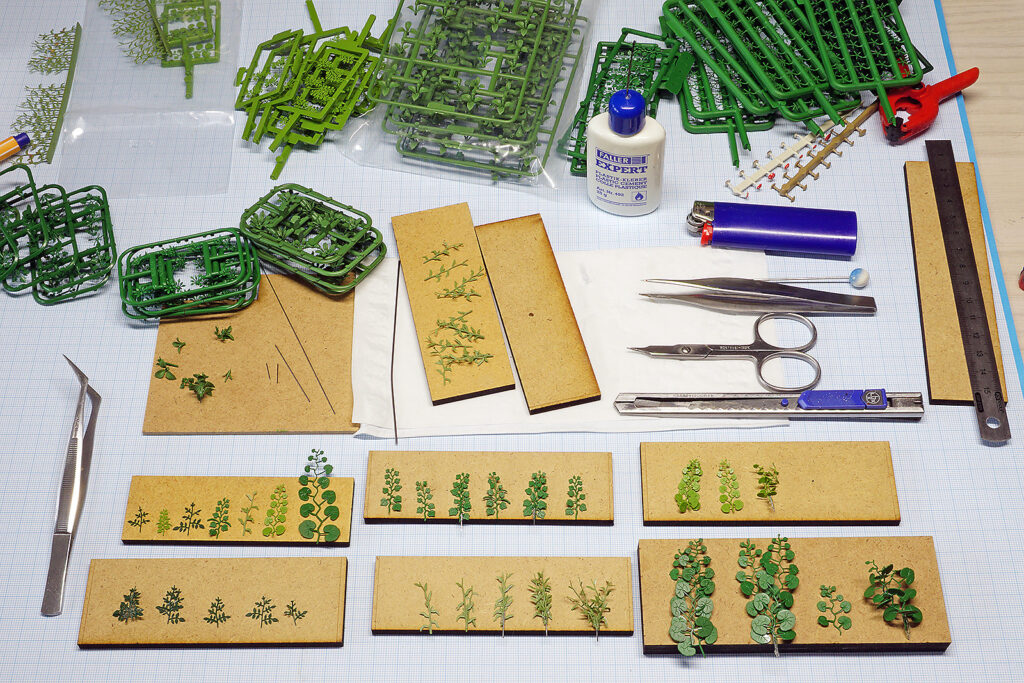 Bei den Busch-Gewächsen aus Kunststoff ging es noch sehr geordnet zu. Auf den kleinen Brettchen liegen unterschiedliche Pflanzen bereit für die im Heft gezeigten Schritt-für-Schritt-Fotos.
