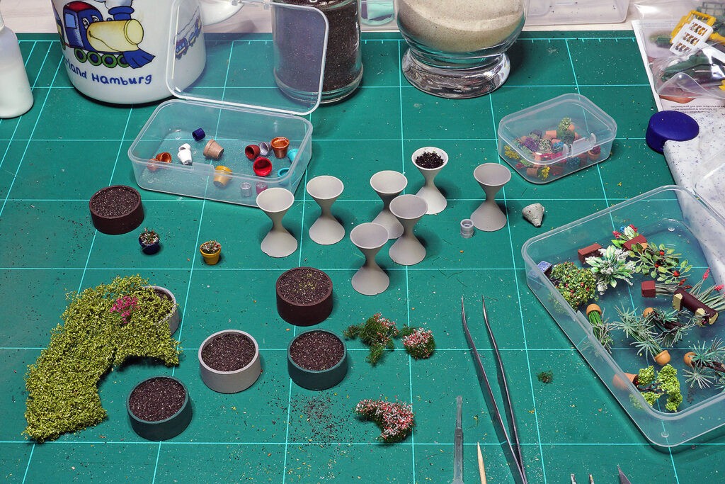 Mit den unterschiedlichsten Materialien wurde experimentiert, um darauszum Maßstab 1:32 passende Gewächse unterschiedlichster Art zu „züchten“.