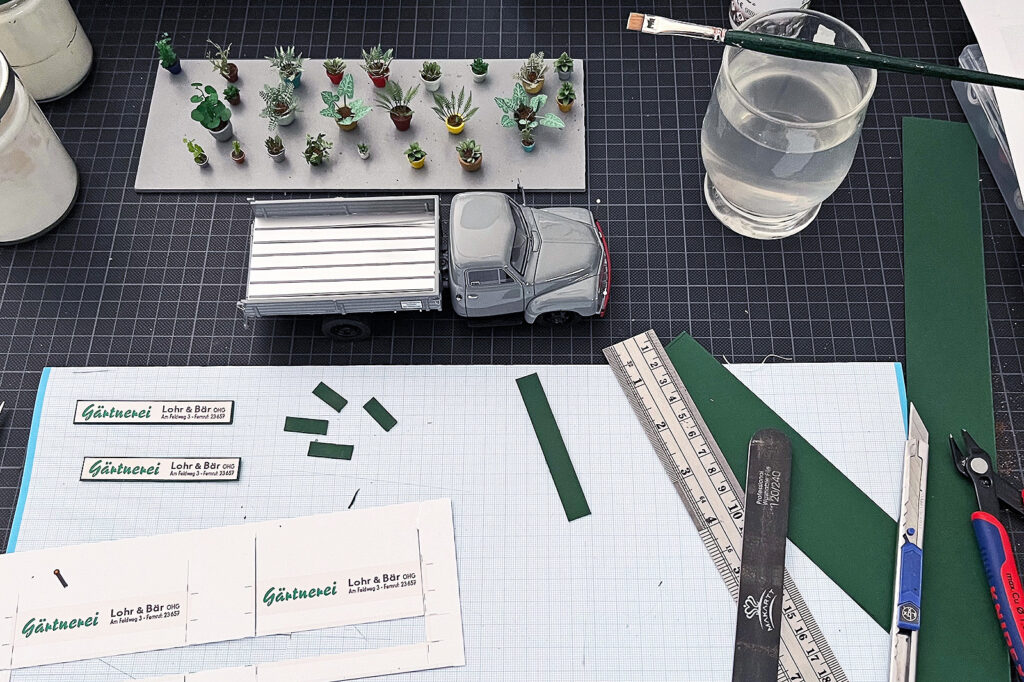 Der Opel Blitz von Mo-Miniatur erhielt dem Thema entsprechende Werbeschilder. Darüber sieht man einen Teil der fertig bepflanzten Töpfe kurz vor dem Fotografieren.