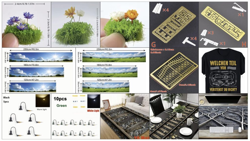 Mitte: Hintergrundkulissen für die Modellbahn? Diese Motive sind als Tischläufer deklariert. Ähnliche gibt es auch zum Aufhängen auf Kunststofffolie für drinnen und draußen, auch in noch größeren Formaten. In 1:35 ist hingegen das fein geätzte Tor daneben. Man muss mehrmals Modellbau-Ätzplatinen anklicken, um mehr davon angezeigt zu bekommen. Einen passenden Suchbegriff haben wir dafür noch nicht gefunden.
