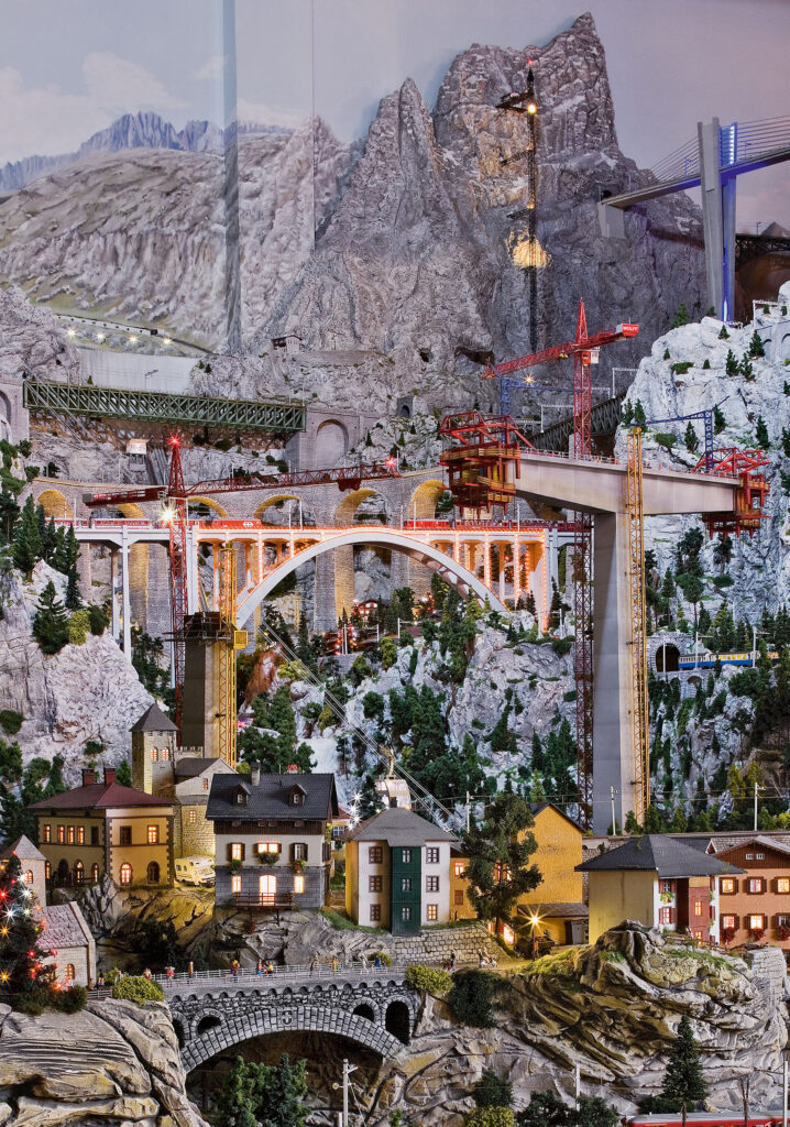 Ein Stockwerk tiefer aus anderer Perspektive: Derselbe Anlagenteil mit der Hochgebirgskulisse. Hier wie dort ist nichts von den Besuchern auf der jeweils anderen Etage zu sehen.