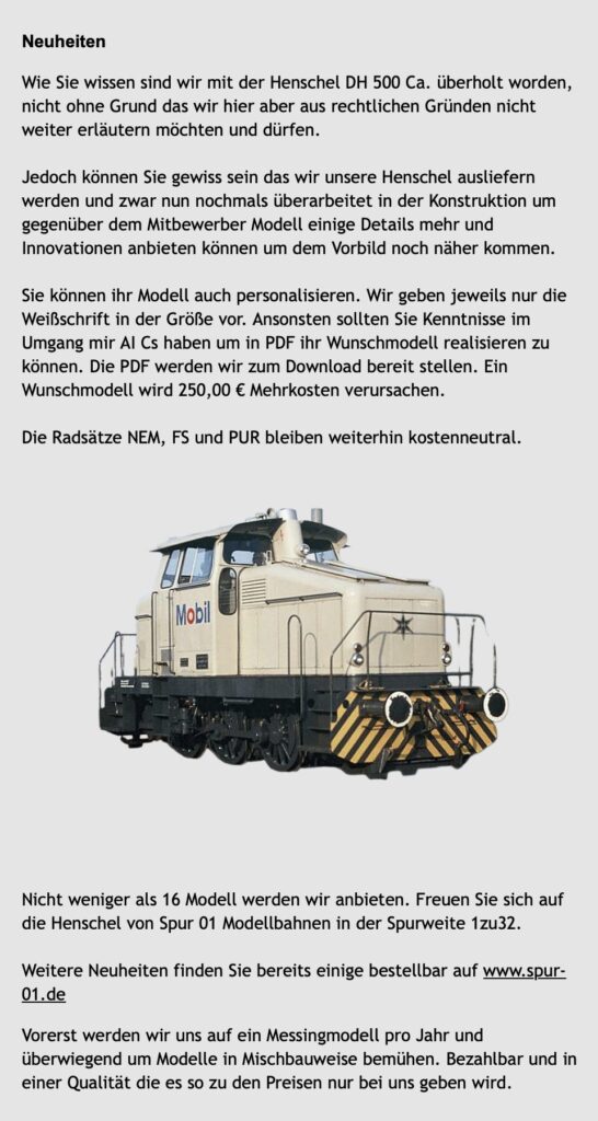 Exakt 40 Tage nach der Betriebsniederlegung hat der Mülheimer Hersteller seine Geschäfte wieder aufgenommen. Neben mehreren Modellen von Personenwaggons, die bereits im Shop offeriert werden, wurde heute auch folgende Neuheit bestätigt.